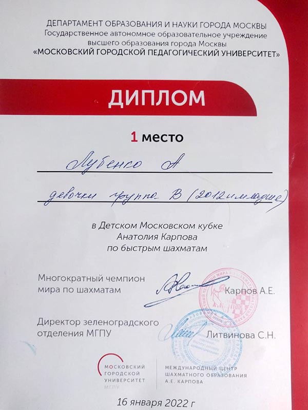 16 января проходил I этап московского кубка А. Карпова по быстрым шахматам. Лубенко А., ученица 4 класса, стала победителем в группе девочек!