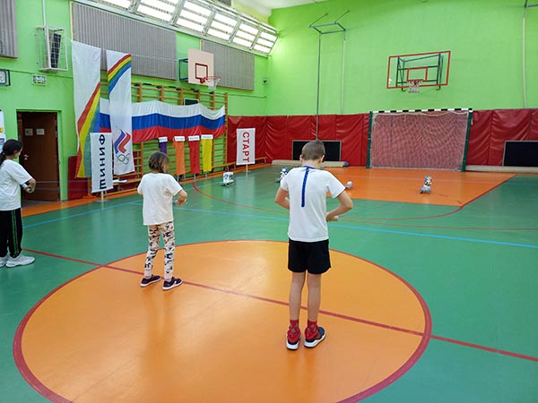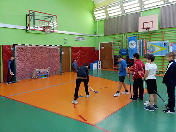 Каждый урок начинался с разминки и показательного выступления ученика 9 класса, игрока хоккейного клуба "Ястребы", Коденева М., а затем дети соревновались в точности бросков по воротам и принимали участие в эстафете талисманов.