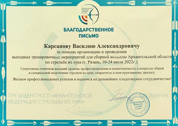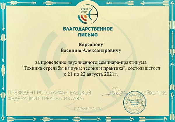 Василий Александрович неизменный участник многих спортивно-методических мероприятий и практикумов, не первый год принимает активное участие в подготовке и проведении выездных семинаров и тренировочных сборов, в том числе для для сборной команды Архангельской области по стрельбе из лука, за что отмечен Благодарственными письмами.