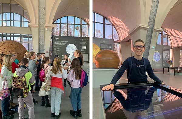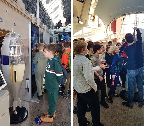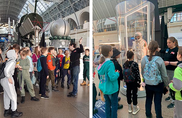 На обзорной экскурсии учащиеся узнали: какое живое существо самым первым отправилось на орбиту, какой аппарат впервые сфотографировал обратную сторону Луны, зачем нужна была орбитальная станция-шпион и почему слово «спутник» с 1957 года известно во всем мире. Ребята увидели полномасштабные макеты спутников, планетоходов и космических кораблей, а также макет знаменитого орбитального комплекса «Мир» в натуральную величину.