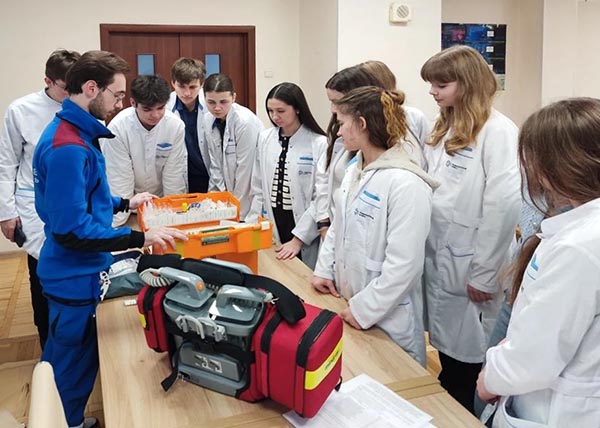 Реанимобиль — это, по сути, перевозная палата реанимации. Ребята увидели не только носилки, но и портативный аппарат искусственной вентиляции легких (ИВЛ), который может «дышать» за пациента, мониторы с постоянным отслеживанием ЭКГ, давления, насыщения крови кислородом, перфузоры (аппараты для точного введения лекарств), дефибриллятор-кардиовертер и целый арсенал препаратов для экстренной терапии. Всё закреплено, но при этом доступно в секунду. «Раньше мы думали, что реанимобиль — это просто скорая помощь покрупнее. Оказалось, это целая операционная на колёсах. Осознание того, что в этой машине реально борются за жизнь, пока везут в больницу, потрясает», — делились впечатлениями учащиеся из 10-В.