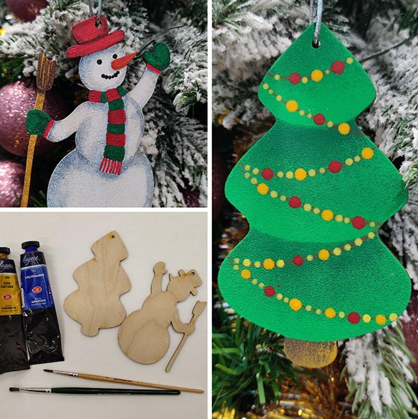 Участники мастер-класса распишут две фанерные заготовки "елочка" и "снеговик" с помощью трех видов росписи (кистевая, трафаретная и точечная).