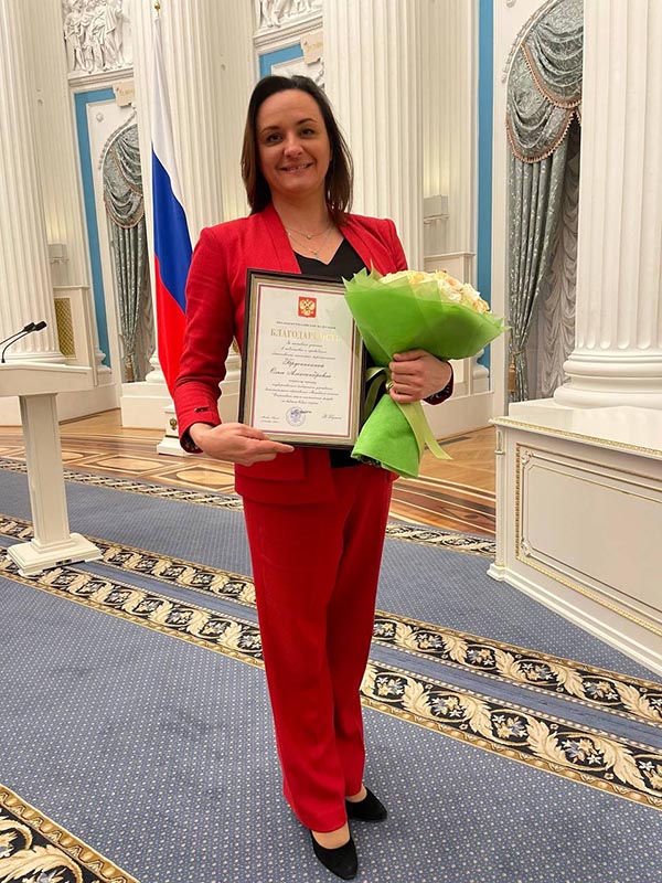Торжественная церемония награждения прошла в Екатерининском зале Кремля, где Ольга Александровна получила эту высокую награду из рук Первого заместителя Руководителя Администрации президента РФ Сергея Владиленовича Кириенко.