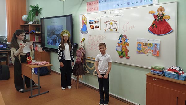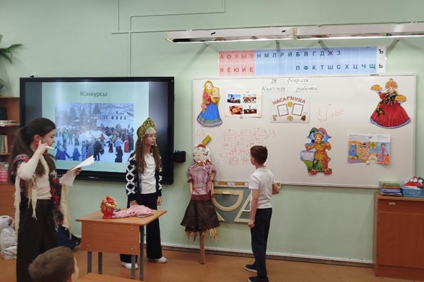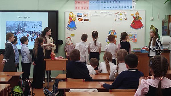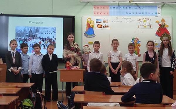 Ребята из подшефного класса рассказали детям 1-А об истории возникновения праздника, традициях и обрядах празднования Масленицы. Не обошлось и без блинов, которые испекли наши родители по самым разнообразным рецептам!