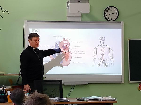 На уроке, посвященном тематике профессии врача кардиолога, дети коснулись вопросов актуальности и роста распространенности сердечно-сосудистых заболеваний в мире. Урок начался с ознакомления основ анатомии и физиологии сердечно-сосудистой системы. В игровой и интерактивной форме были изучены отделы сердца, азы электрофизиологии.