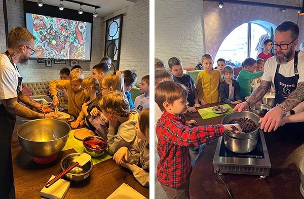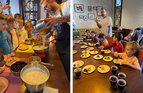 Кондитерская расположена в старинном высотном здании на Кудринской. Заведение небольшое, но уютное. У витрины можно засмотреться на необыкновенные десерты и красивые пирожные в оригинальном исполнении. Олег Борисович радушно встретил гостей, провел экскурсию по части Сталинской высотки. Особое впечатление у детей остался мастер - класс по самостоятельному приготовлению шоколадного десерта, которым ребята угостили своих родителей.