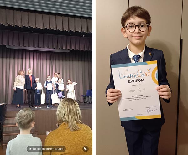 Марк, ученик 2-Е класса, выступил на конференции Лантанум среди второклассников и получил достойное 3-е место за представленную проектную работу: «Как измерить высоту дерева без лестницы: математические методы».
