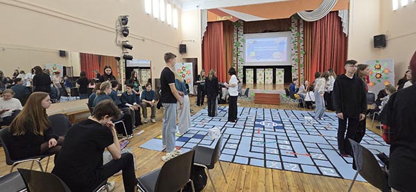 Медиаклассники школы 1741 придумали игру для гостей с вопросами и заданиями, которые надо было выполнять на скорость. Точность ответов не всегда гарантировала успех – в игре присутствовал элемент везения. Например, участник мог выполнить задание, но из-за броска кубика получал обратный ход или поединок. Вместо фигур на поле работали лидеры команд и, не сходя с места, помогали свои ребятам выполнять задания. Наша команда работала слаженно и быстро, что и привело ребят к победе!