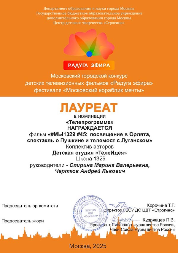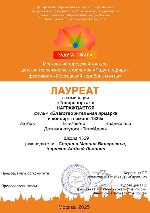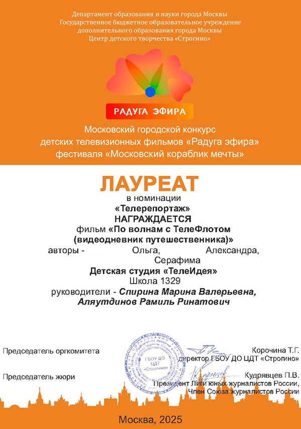 Два видеоролика стали лауреатами в номинации «Телерепортаж»: «По волнам с ТелеФлотом» (авторы – Ольга, Серафима и Александра) и «Благотворительная ярмарка в школе 1329» (авторы – Елизавета и Владислава).