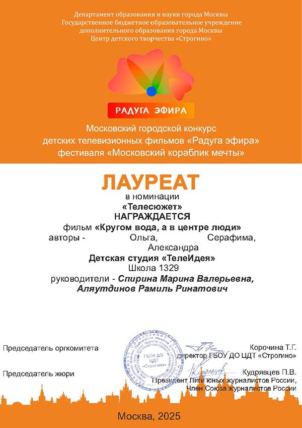 В номинации «Телесюжет» диплом лауреата получил ролик «Кругом вода, а в центре люди» (авторы – Ольга, Серафима и Александра).