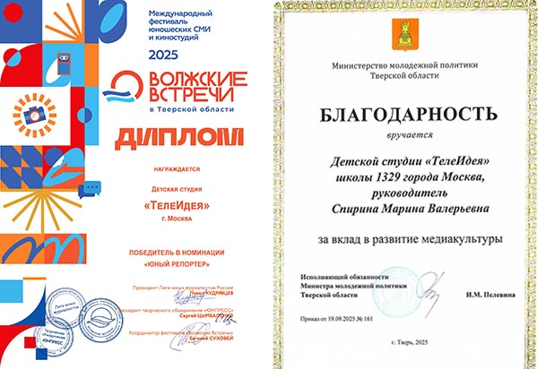 Ребята получили диплом в номинации «Юный репортер». На конкурс телестудия школы 1329 отправляла выпуск программы #МЫ1329.