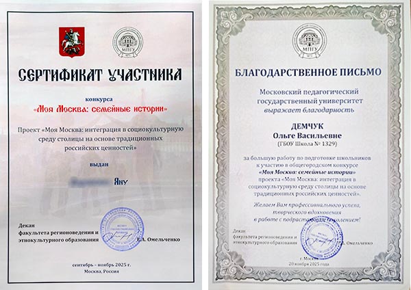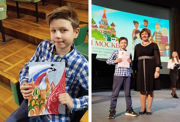 В рамках проекта "Моя Москва: интеграция в социокультурную среду столицы на основе традиционных российских ценностей", организованным Московским педагогическим государственным университетом по поручению Департамента образования и науки города Москвы, ученик 2-Б класса Ян принял участие в общегородском конкурсе "Моя Москва: семейные истории".