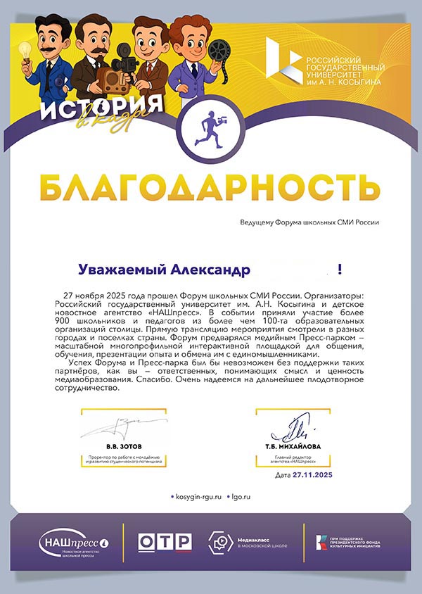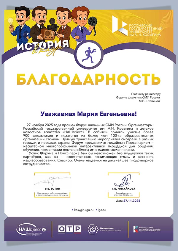 Форум школьных СМИ дает старт масштабным проектам, таким как Марафон школьных СМИ, профориентационные соревнования Медиатон и выставка-передвижка. Участниками нового сезона стали более 3000 ребят из 43 городов 26 регионов нашей страны. В этом году на Форуме презентовали новый проект «История в кадре», его партнером стало Общественное телевидение России.