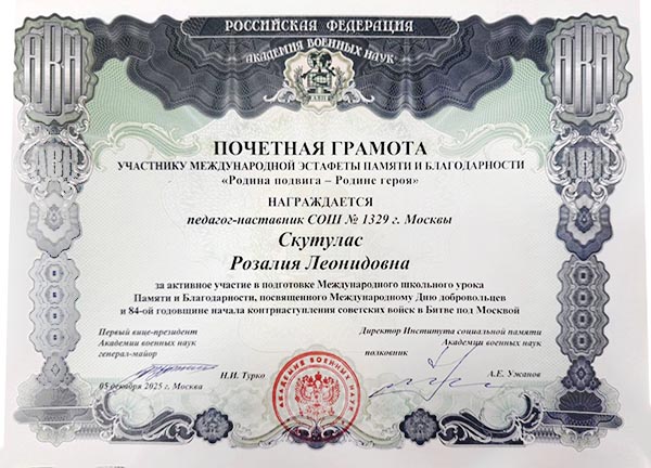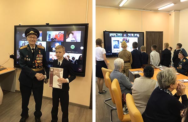 Наши музейные активисты классов 5-Д, 5-Е, 5-Т, 6-Т, 7-Д, 7-Э, 8-Д великолепно выступили с литературными выступлениями и блестящими докладами о Героях Московской битвы 1941 года, а также продемонстрировав ветеранам и гостям встречи ролик о поездке ребят по местам героического сражения Вяземской стратегической операции 1941 года в Смоленскую область. На мероприятие пришли со стихами чтецы 3-Д, 4-Д классов и ученики 7-З - с подарками ветеранам. В завершении телемоста были вручены благодарственные письма и подарочные наборы ветеранам!