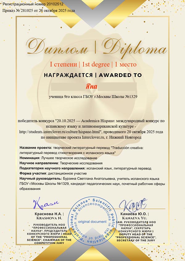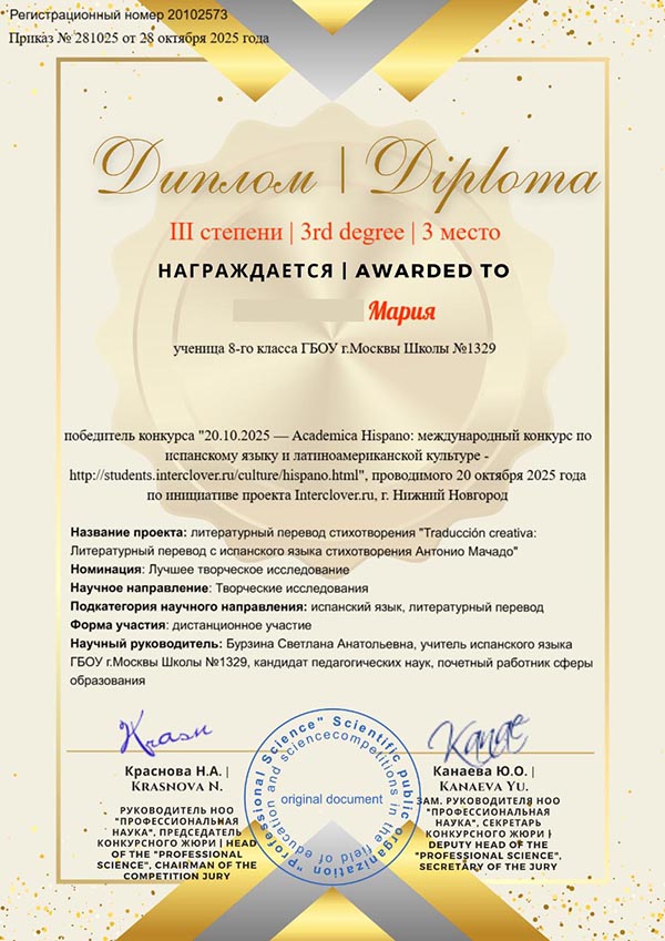 Яна (9 класс) заняла 1 место за перевод стихотворения Пабло Неруда, Мария (8 класс) заняла 3 место за перевод стихотворения Антонио Мачадо.
