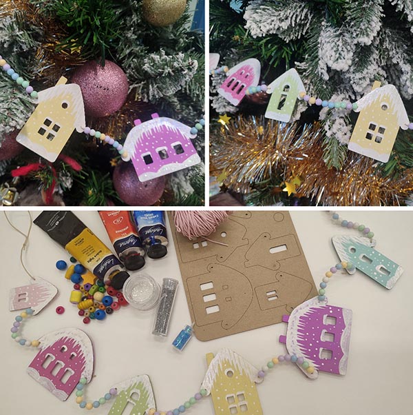 Участники мастер-класса распишут акриловыми красками 7 чипбордов (вырубки из плотного картона), украсят снежные крыши домиков блестками и дополнят гирлянду разноцветными бусинами. Длина гирлянды около 70 см.