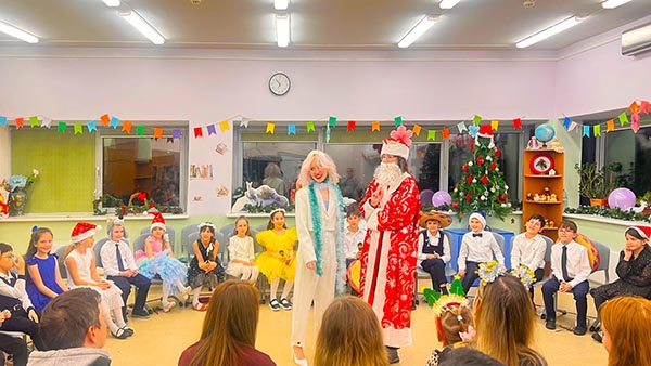 В мероприятии принимали участие бывшие выпускники музыкального отделения школы Елизавета и Альфия, которые прекрасно справились с ролями Деда Мороза и Снегурочки. Они с большим юмором и задором играли с ребятами в снежки, загадывали загадки, пели песни и в самом конце мероприятия вручили им сладкие подарки.